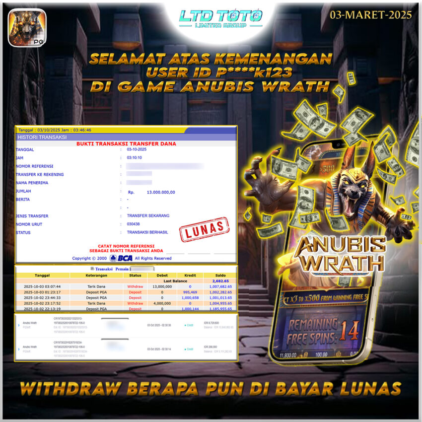 Selamat kepada User id : HURI*** Telah berhasil mendapatkan kemenangan besar pada permainan SLOT ANUBIS WRATH, kemenangan Sebesar Rp.13.000.000, Setelah mengisi formulir withdraw dengan kurang waktu hanya 5 – 10 menit pihak LTDTOTO sudah melakukan transfer kepada pemilik User id dan dana sudah dapat di cairkan oleh pemenang. Bukti pembayaran yang kami berikan merupakan bukti pembayaran yang SAH / VALID yang langung di dapatkan melaui tanda transfer transaksi dari Bank yang di tuju. Kami mengucapakan banyak Terima Kasih Kepada pemenang karena sudah mempercayakan kami sebagai Bandar Tepercaya yang membayar semua kemenangan member hingga lunas. Masih ragu dengan LTDTOTO bos ? Di mana bandar togel online sekarang yang terpercaya seperti LTDTOTO? Bandar yang mengirimkan kemenangan member tanpa bertele – tele. Jadi…. tidak perlu khwatir pada situs LTDTOTO karena kemenangan anda berapapun akan dibayarakan hingga lunas kepada pemenang.