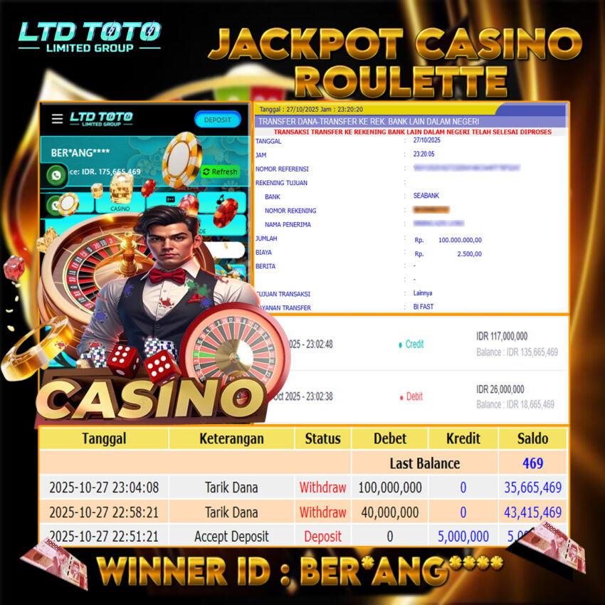 Selamat kepada User id : BER*ANG**** Telah berhasil mendapatkan kemenangan besar pada permainan CASINO PP LIVE ROULETTE , kemenangan Sebesar Rp.100.000.000, Setelah mengisi formulir withdraw dengan kurang waktu hanya 5 – 10 menit pihak LTDTOTO sudah melakukan transfer kepada pemilik User id dan dana sudah dapat di cairkan oleh pemenang. Bukti pembayaran yang kami berikan merupakan bukti pembayaran yang SAH / VALID yang langung di dapatkan melaui tanda transfer transaksi dari Bank yang di tuju. Kami mengucapakan banyak Terima Kasih Kepada pemenang karena sudah mempercayakan kami sebagai Bandar Tepercaya yang membayar semua kemenangan member hingga lunas. Masih ragu dengan LTDTOTO bos ? Di mana bandar togel online sekarang yang terpercaya seperti LTDTOTO? Bandar yang mengirimkan kemenangan member tanpa bertele – tele. Jadi…. tidak perlu khwatir pada situs LTDTOTO karena kemenangan anda berapapun akan dibayarakan hingga lunas kepada pemenang.