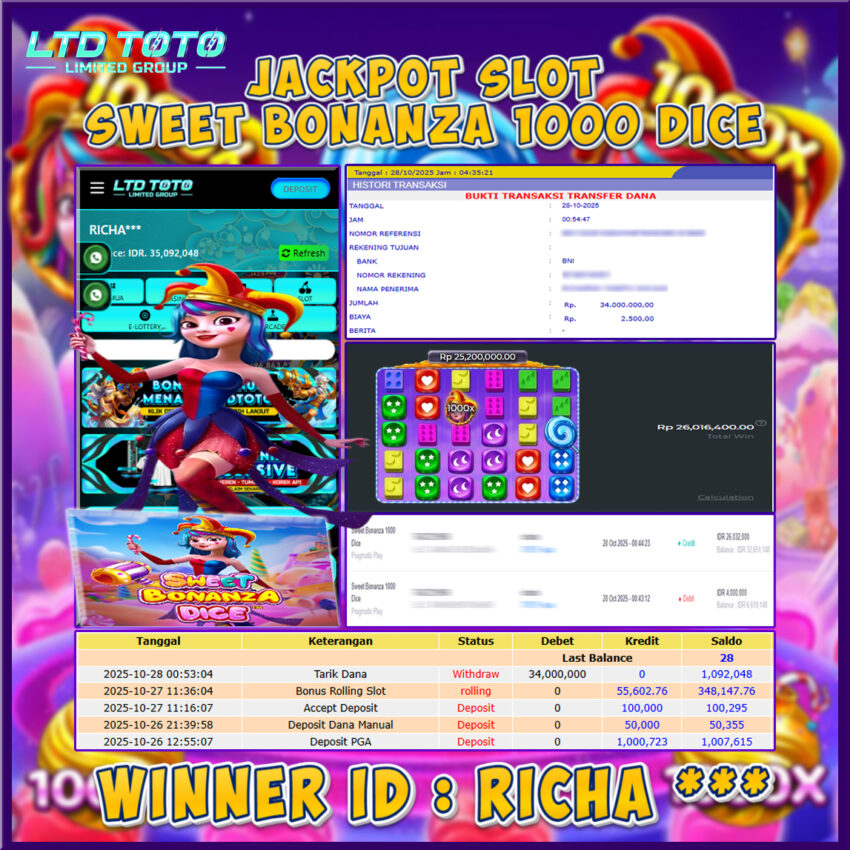 LTDTOTO JACKPOT SWEET BONANZA 1000 DICE RP 34.000.000 SELASA 28 OKTOBER 2025